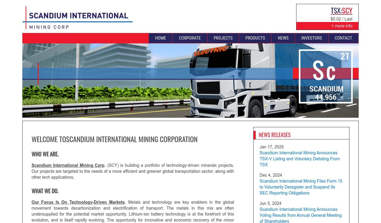 Scandium International Mining Corp is a Canadian company that is focused on the exploration and development of scandium deposits. Scandium is a rare earth element that has a variety of industrial applications, including in the aerospace, automotive, and electronics industries.