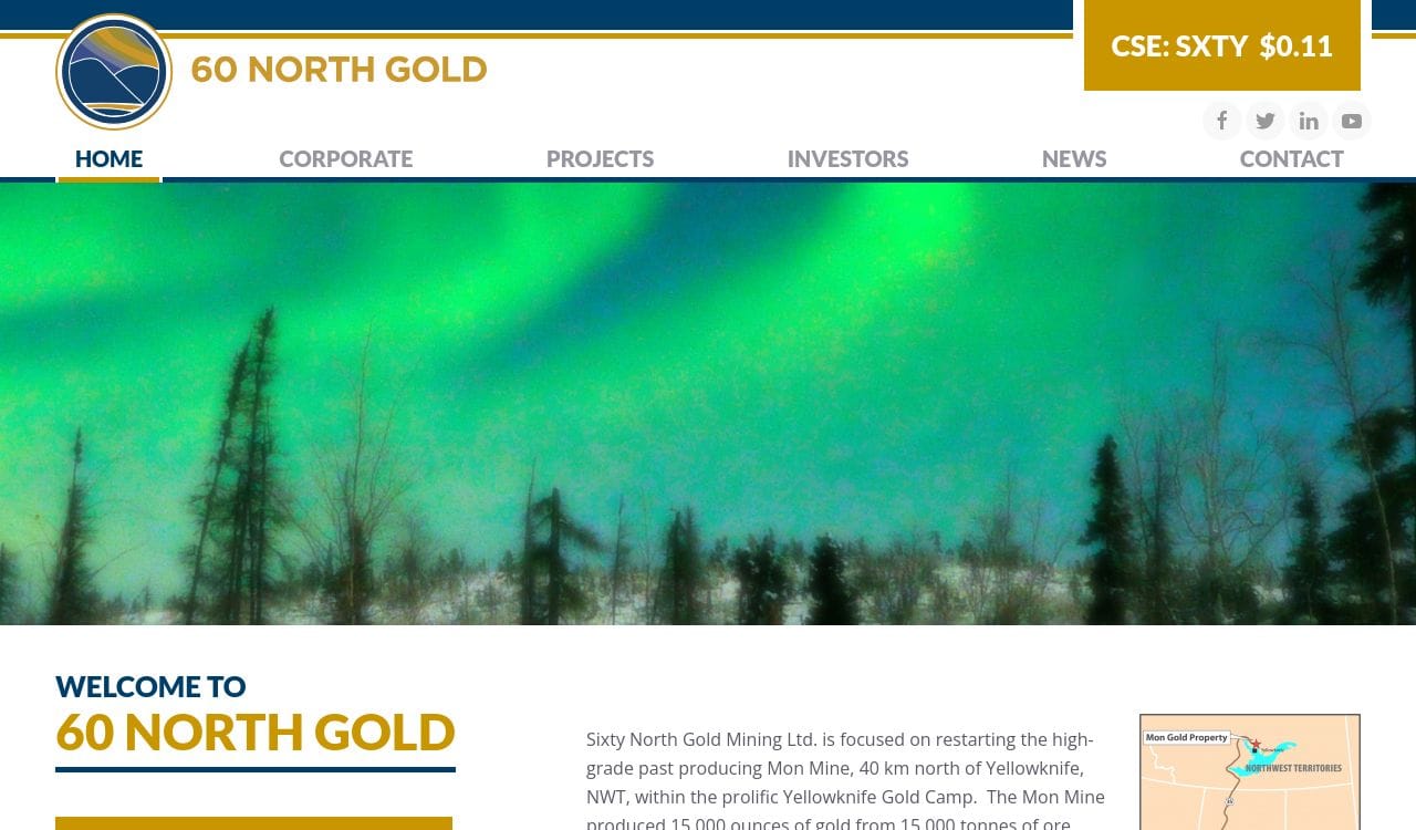 Sixty North Gold Mining Ltd. is a junior gold development company focused on the Mon Gold Project, located near Yellowknife in the Yellowknife Greenstone Belt.