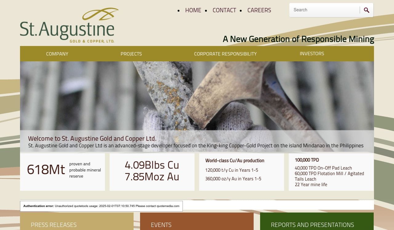 St. Augustine Gold and Copper Limited is a mining company based in the Philippines. The company is focused on the development of the King-king copper-gold project, which is located in the Compostela Valley province of the Philippines. The project is one of the largest undeveloped copper-gold deposits in the world, with estimated reserves of 5.4 billion pounds of copper and 9.3 million ounces of gold.