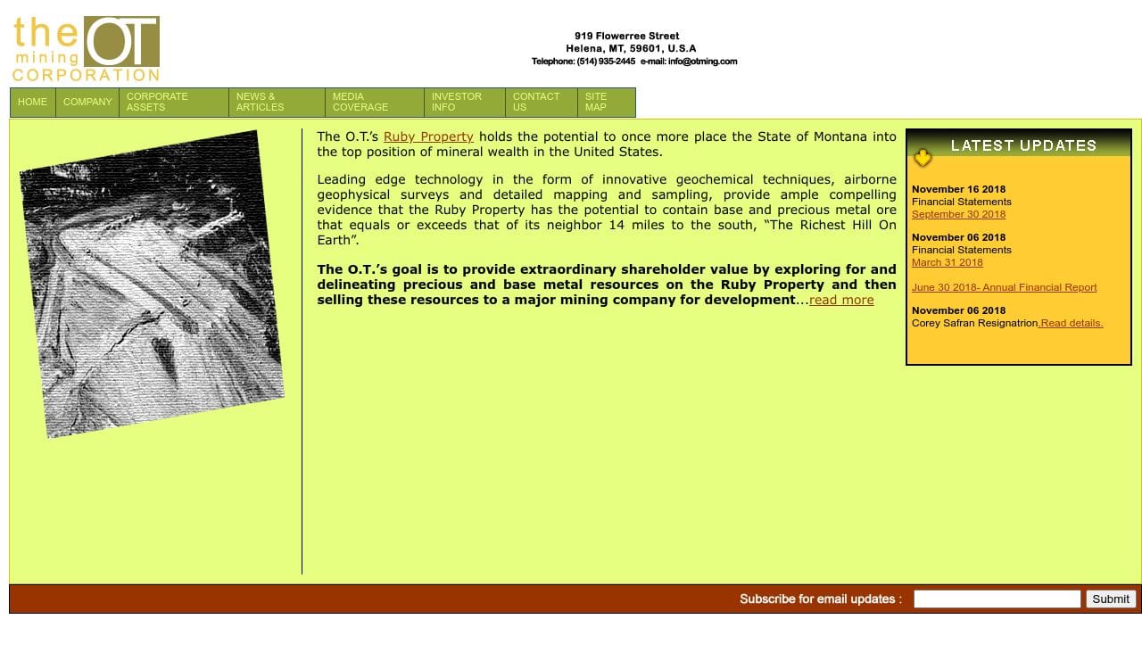 The O.T.s goal is to provide extraordinary shareholder value by exploring for and delineating base and precious metal resources on the Ruby Property-A large property situated in an area of outstanding mineral potential between Montana Tunnels and the Butte Mining Camp.