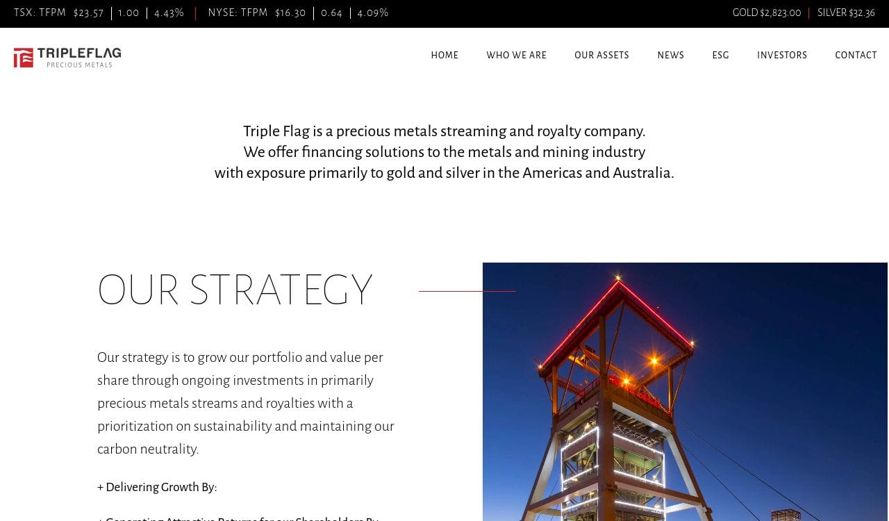 Triple Flag Precious Metals Corp was founded in 2016 and is headquartered in Toronto, Canada. The company's portfolio includes streaming and royalty agreements with mining projects around the world, including gold, silver, and other precious metals.