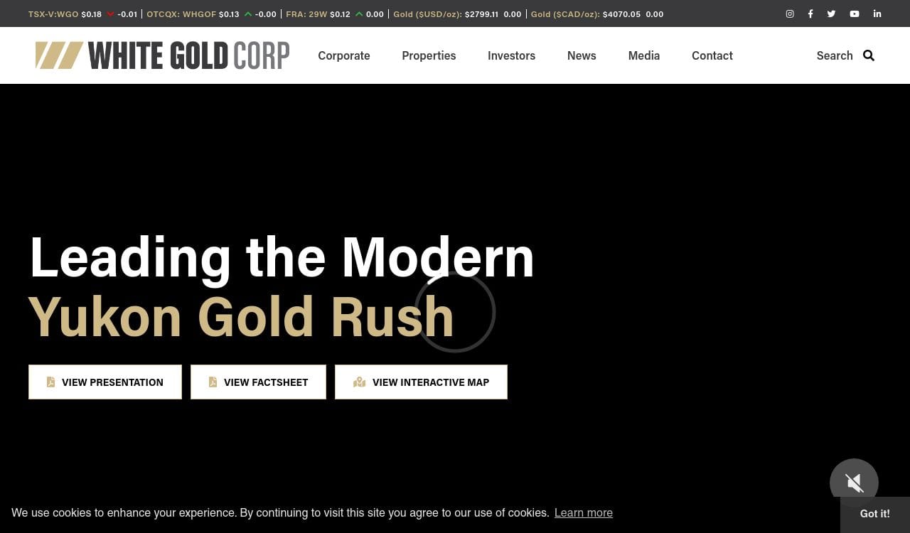 White Gold Corp is a Canadian-based exploration and development company focused on acquiring and advancing gold projects in the Yukon Territory. The company was founded in 2016 and is headquartered in Toronto, Ontario.