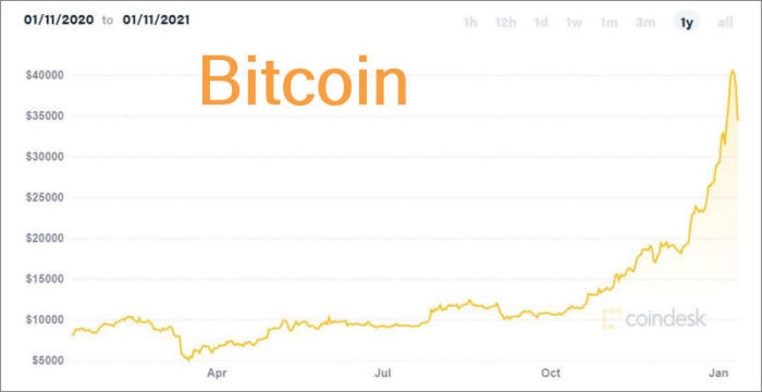 Getting back to gold and why it hasn't performed as well as expected, there is a lot of news out regarding a lot of private and public funds that held gold are now seeing that gold being sold and the money then going into Bitcoin. Bitcoin, the digital currency has gone from a low of $5,000 in March to over $40,000 this past week. Infact the price rallied $20,000 just this month of January alone setting a new all time high of $40,880.