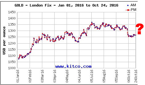 With less than two weeks left until the election this year we could have almost any kind of scenario. Gold could very well get slammed by the bullion banks and comex down to another low, there could very well be some kind of news like a war with Russia or something that would turn gold into a safe haven and it would rise, Hillary might get arrested, or the election could just come and go and the price of gold will do nothing.