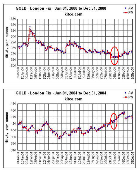 The author mentioned that gold always had a tendancy to suffer during election years. Being a bit curious I decided to check out a few past elections to see if this was true.
