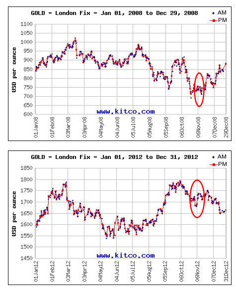 In 2000 the gold price at election time was at its lowest for the year, however during the 2004 election you can see that the gold price is well off the 52 week low. In fact the price is on a rise. In 2008 the price was on a 52 week low but in 2012 aside from a slight dip with a quick rebound around election day the price was closer to the 52 week high than it was to the low.