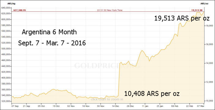 The above the chart just goes to show how bad things can get and just how quick these bad things can happen with a countries currency. In the chart below you can see and exploded view of just how rampant things can get. Below is a 6 month chart of gold in the Argentine Peso. Even if you would have bought gold or silver around Christmas time, look how you have perserved your wealth due to inflation and devaluation of your currency. Argentina imports just went up 100% since that time. Your bank account has lost half it's value. Imagine saving up for a down payment on a home. One look at that chart and the only thing it is going to tell you is that you'll just have to keep working a whole lot longer.