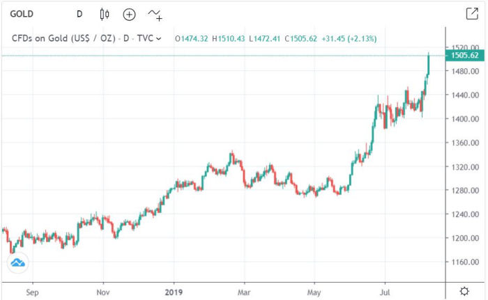 Today, August 7, 2019, gold broke out past $1,500 USD per ounce. It's still got a ways to go to break past it's old 2011 high of $1900 but in other currencies this metal is really shining. In CAD the price hit a new all time high of $2011. In AUS the price hit $2224 and in New Zealand the price hit $2330 per ounce. Silver is also starting to makes some moves but still has a long way to go to catch up with gold.