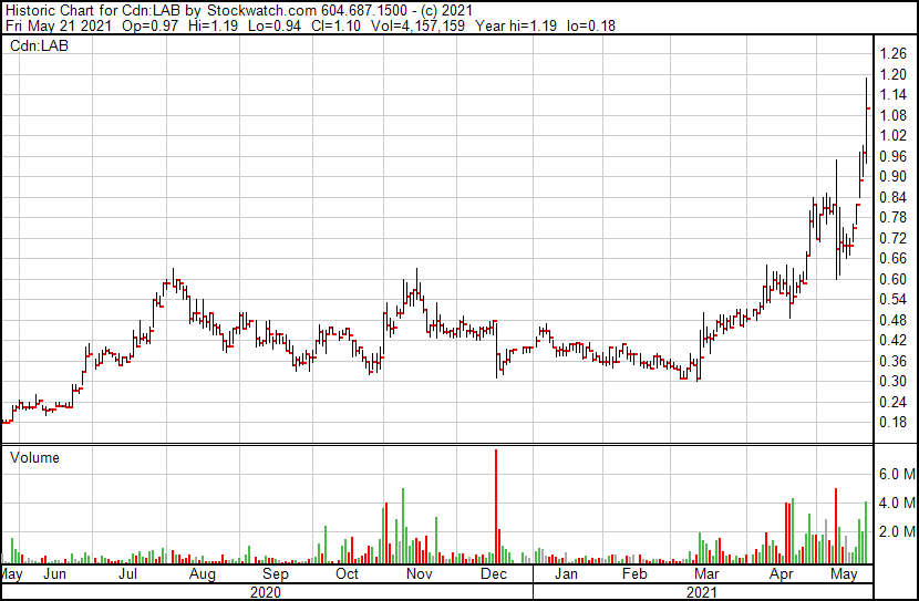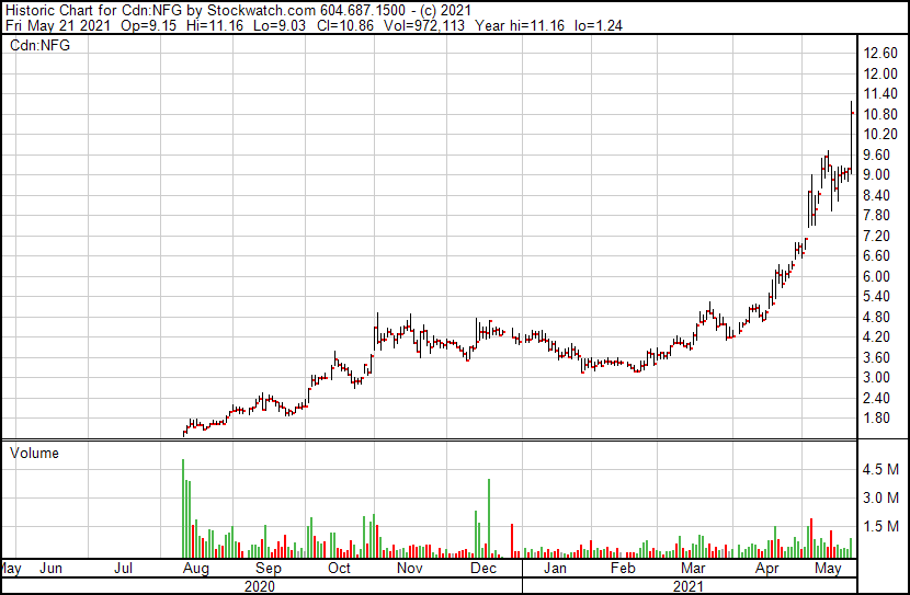 Most of this area got noticed once Newfound Gold TSX-V:NFG went public last year and has since embarked on a massive 200,000 meter drill program. This all started after the initial discovery hole of 41.2 g/t Au over 4.75m and 25.4 g/t Au over 5.15m, follow up drilling is indicating continuity to depth with recent deeper results including 225g/t Au over 2.5m. Since that time the company just keeps pouring out the news and the grades just keep getting higher it seems. In the last news release May 21, 2021 they reported 146.2 g/t Au over 25.6 meters in a 65 meters step-out. It's these kind of results that makes stock prices go crazy. This stock has already become a 10 bagger in less than a year.