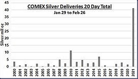 There was more physical silver purchased during the first quarter of this year than all the phyical silver purchased within the last 20 years. Of course a lot of this buying is being spurred by the wall street bets crowd who have hundreds of thousands of members out buying any physical silver they can get their hands on. Infact there are stories floating around the web that the Australian mint has NO silver in stock and can not mint any new bars or rounds. All of this is totally opposite to the supply and demand logic. Usually when demand outstrips supply, prices rise. But in this case the prices have fallen on the paper side but not so much on the physical side.