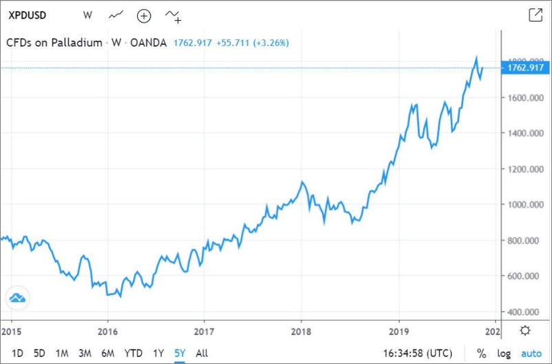 Since the middle of last year, palladium has been on the rise from around $800 to a high today of $1800. That's a rise of approx. $900-$1000 in the last 18 months or so. That's like a 100% rise in the price of palladium and it seems very few are noticing. I skim the headlines of various websites daily looking for clues to anything that might be on the move in the metals and I have yet to see anything related to palladium and it's rise since the new year. In fact today November 20, while all eyes are on the Amazon or Facebook and seeing what the Fed is going to do, the price of palladium rallied about 30 bucks from $1756 up to $1786. FYI - The all time high for palladium was $1821 on October 30 and the low was $78 back in 1993.