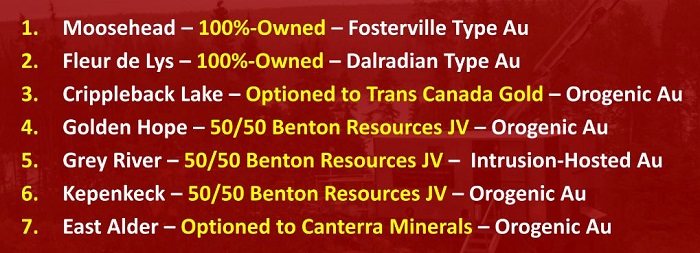 The company has several other properties in it's portfolio of land holdings. The Fleur de Lys Project consisting of 1,920 claims (480 sq km). The Grey River Project which is joint with Benton Resources and consists of 324 claims. The company also has joint ventures with benton in the Kepenkeck and Golden Hope properties. Then Kepenkeck consists of 595 claims (15,625 hectares) and the Golden Hope consists of 3,146 claims (78,650 hectares) This is in the area as the former Hope Brook Gold Mine, and the advanced Cape Ray Project.