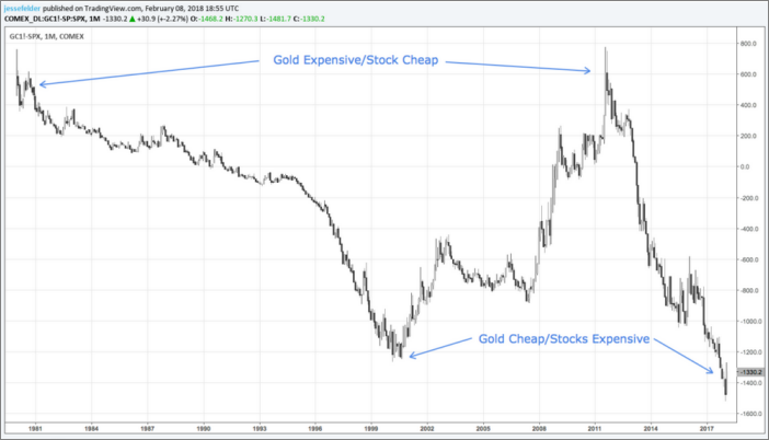 The chart above is a 40 year chart showing the difference between equities and gold. Most recent was of course 1999-2000 when gold prices were $260 per ounce. From that point on gold started it's bull run to 2011. Fast forward to today and we see that bullion is even cheaper compared to stocks than it was back in 2000.